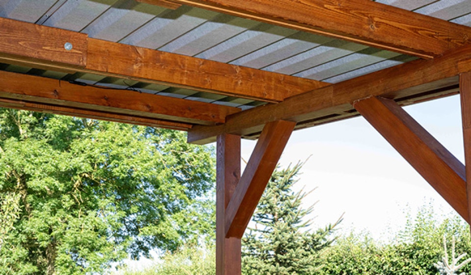 Das Dach selbst. Hier handelt es sich um ein verzinktes Trapezstahlblech. So wird sichergestellt, , dass die Unterseite der Module sowie die Steckverbindungen weitestgehend trocken bleiben. Das Dach selbst ist von unten mit einer Antitropfbeschichtung ausgestattet, damit kein Kondenswasser entsteht und es unter dem Carport weitestgehend trocken bleibt.